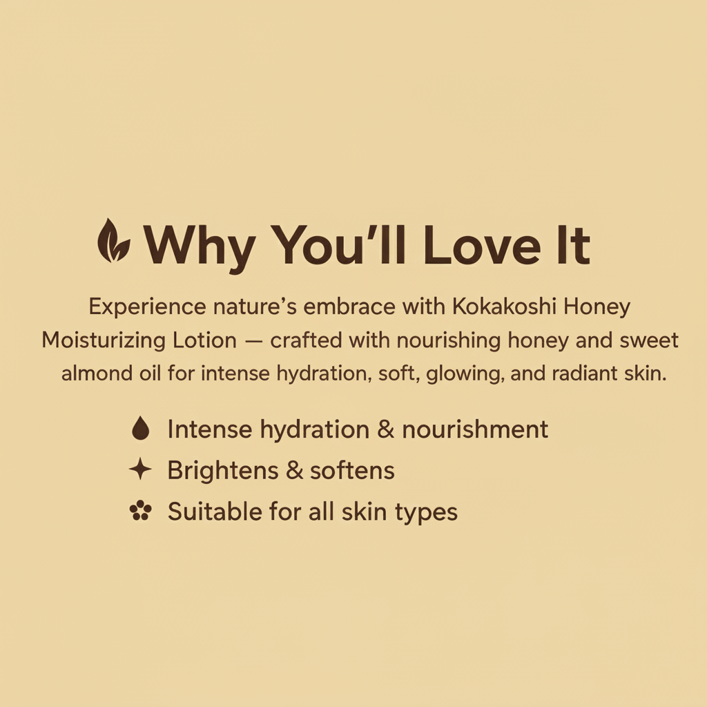 Nourish your skin every day with Kokakoshi Honey Almond Moisturizing Lotion, a rich yet lightweight formula designed to deliver intense hydration, softness, and a healthy natural glow.