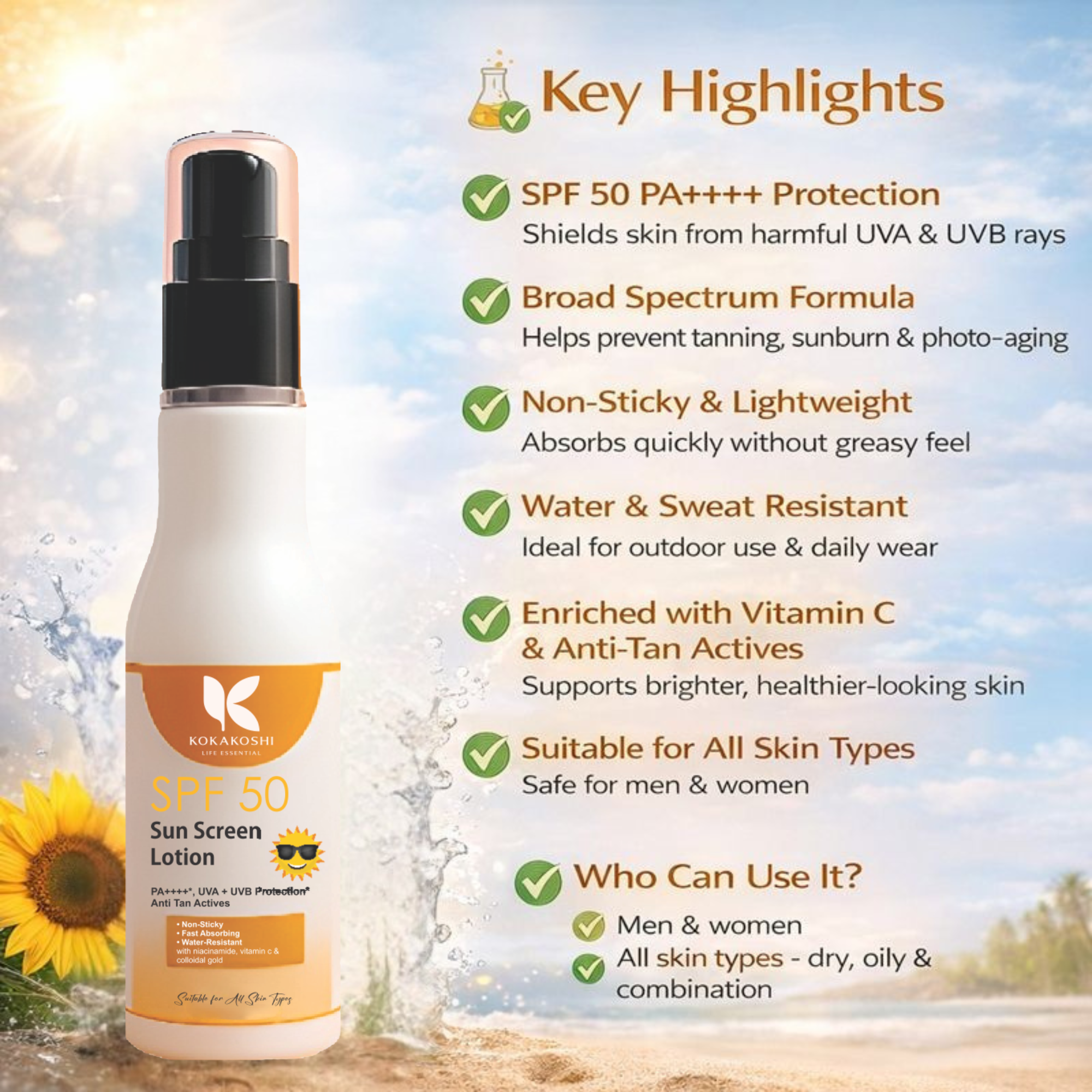 SPF 50 Sunscreen Lotion | PA++++ Broad Spectrum Protection | Kokakoshi